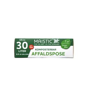 Komposterbare affaldsposer 30 liter. Affaldsposer fra Maistic er komposterbare og indeholder ikke alm. plastik. Poserne bærer certificeringen OK Compost HOME og kan dermed nedbryde til vand, CO2 og biomasse – også hvis de skulle havne i naturen. Materiale (Læs mere)