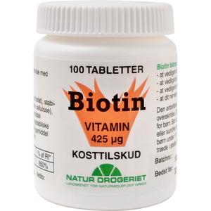 Natur-Drogeriet Biotin tabletter 425 µgVitaminkosttilskud fra Natur-Drogeriet, til dig der er i underskud af B-vitaminet B7. B-vitaminer er vandopløselige, hvilket vil sige, at de let udskilles med urinen. Vitaminerne findes i adskillige fødevarer, men d (Læs mere)