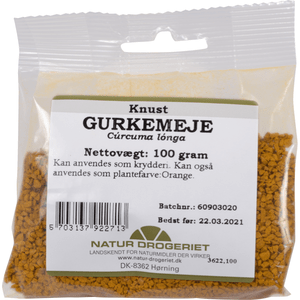Natur-Drogeriet Knust Gurkemeje – 100gGurkemeje kommer fra en ingefærlignende plante, og er på grund af sine smags- og farvegivende egenskaber lidt af et vidundermiddel. Den koncentrerede gule farve, som krydderiet har, benyttes både til at farve madvarer (Læs mere)