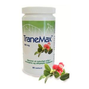 TraneMax – 80 kapslerTraneMax er et koncentreret tranebærekstrakt.Dosering:Voksne: 1 kapsel morgen og aften. Ved ekstra behov 2 kapsler 3 gange dagligt. Den anbefalede dosering bør ikke overskrides. (Læs mere)